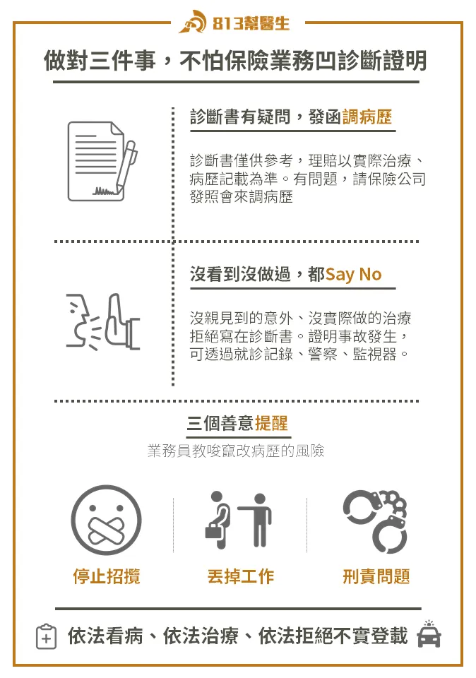 - 反向詢問:如果業務員仍不收斂,醫師可以冷靜詢問:「請問您的公司是哪一家?您的登錄字號是?既然您認為修改診斷書是業界常態,我想我可以請主管機關來關心一下貴公司的教育訓練。」